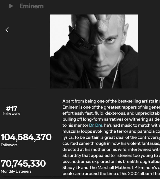 Eminem’s audience is growing. He now pulls in over 21 million daily streams, which is 3 million more than he had in September when he reached 59 billion total streams. Additionally, he gains around 150,000 daily listeners and over 25,000 new followers every day. Overall, their total number has surpassed 104 million.