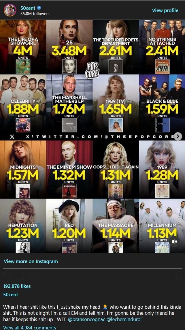 Another familiar face appears further down the list, accompanied by another classic. 50 Cent’s “Get Rich or Die Tryin’” takes the 15th spot, debuting with 1.14 million units. That places it ahead of the Backstreet Boys’ “Millennium” (1.13M) and just behind Taylor Swift’s “Red” (1.2M).