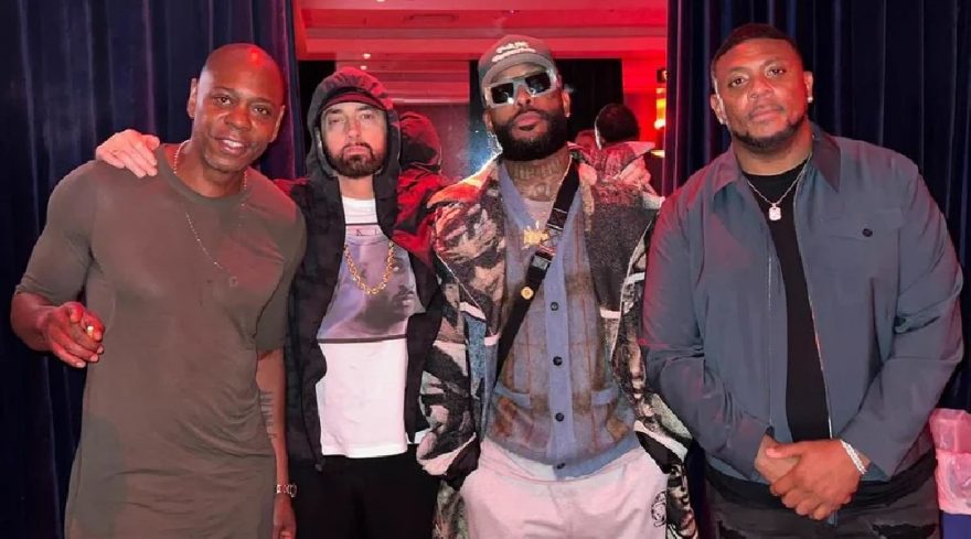 It is not as extensive this time as Dave’s famous 8 Mile parody from his original Dave Chappelle Show in 2004. This acknowledgement is more personal and highlights the relationship between a comedian and a rap star. It is a photo taken backstage at Chappelle’s show at Little Caesars Arena in Detroit that Eminem attended together with Royce, 5’9, and Mr. Porter in September 2023.