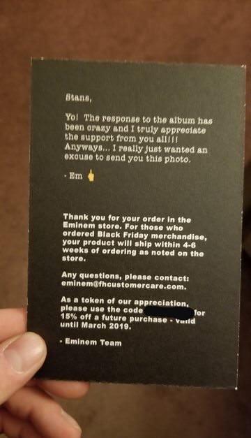 Eminem is sending Christmas cards to fansBy Stanley Mitchell / December 10, 2018 One of the fans shared a photo of a postcard, which he received with his order of the Black Friday merchandise from the Eminem’s Official Store. The postcard holds a humorous congratulations from Eminem.