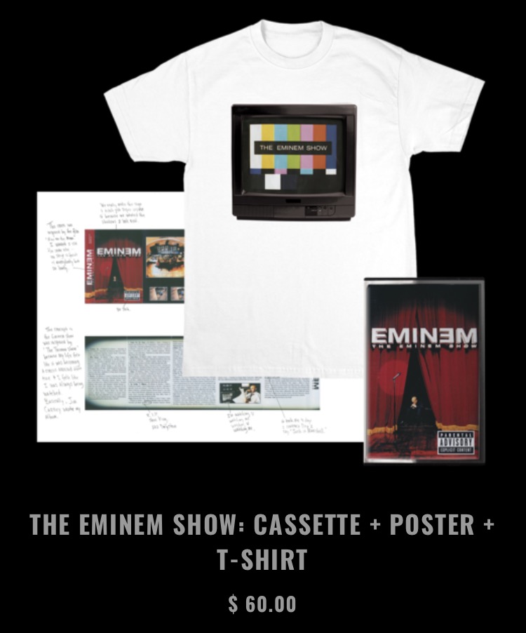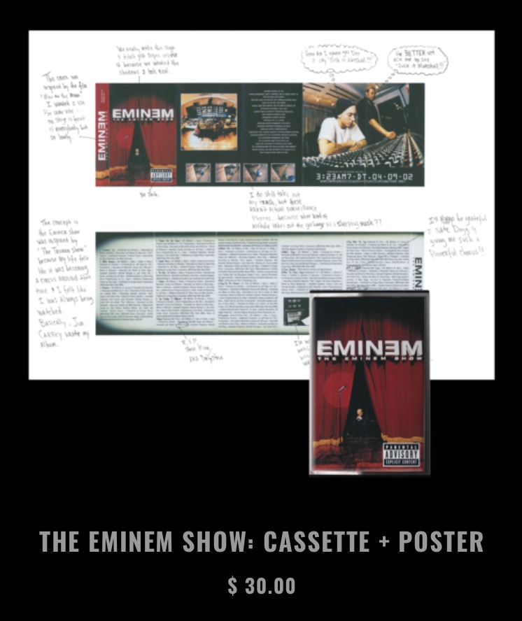Celebrate the Anniversary of The Eminem Show with limited edition cassette re-issue, featuring a lenticular motion printed cover, plus a t-shirt that pays homage to album artwork featured in the liner notes. Bundle also includes an autographed 24″ x 18″ poster featuring prints of handwritten annotations of the liner notes by Eminem.