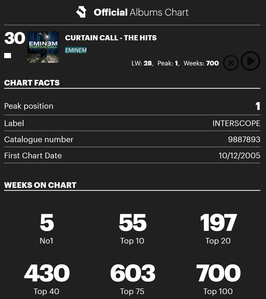 This week, “Curtain Call” clocks 700 weeks on the UK Official Albums Chart. That chart, similar to the Billboard 200, measures both sales and streaming activity across the country. And, similar to US consumption, which made “Curtain Call” the first hip hop album in history to spend over 750 weeks on the chart, UK listeners keep the compilation in constant rotation.