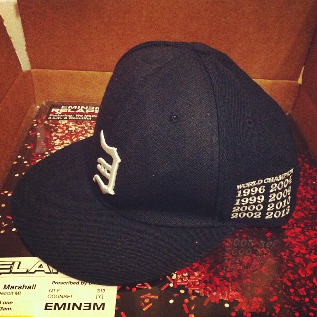 EMINEM BASEBALL TRIBUTE CHAMP HAT — HOME LIMITED EDITIONBy Stanley Mitchell / November 5, 2013 Do you remember the first news about MMLP2? It’s symbolic but the baseball cap with dates was received on the release day.