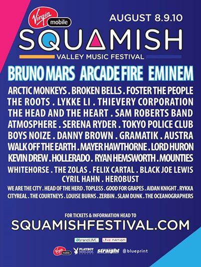 http://www.squamishfestival.com : We’re back for our fifth year with an unprecedented lineup featuring three of the world’s top musical artists: Eminem, Bruno Mars and Arcade Fire. Produced by Live Nation Canada in partnership with festival creators brand.LIVE Management Group, the 2014 Festival takes place at the Logger Sports Grounds and Centennial Fields in Squamish on August 8, 9 & 10, 2014.