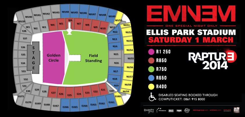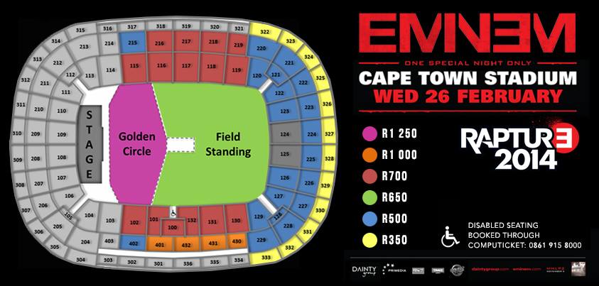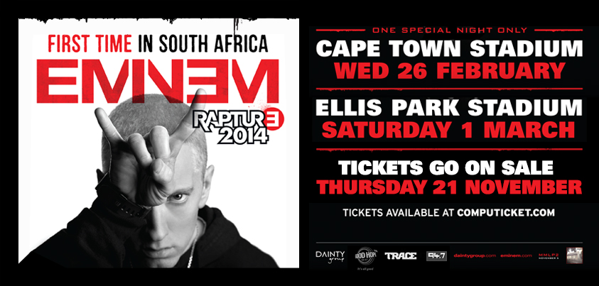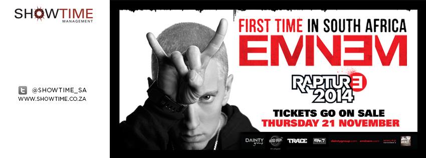 Showtime Management posted on its Facebook page: “We are proud to announce the Eminem Rapture Tour, brought to you by Primedia in association with Dainty group and Showtime Management.”