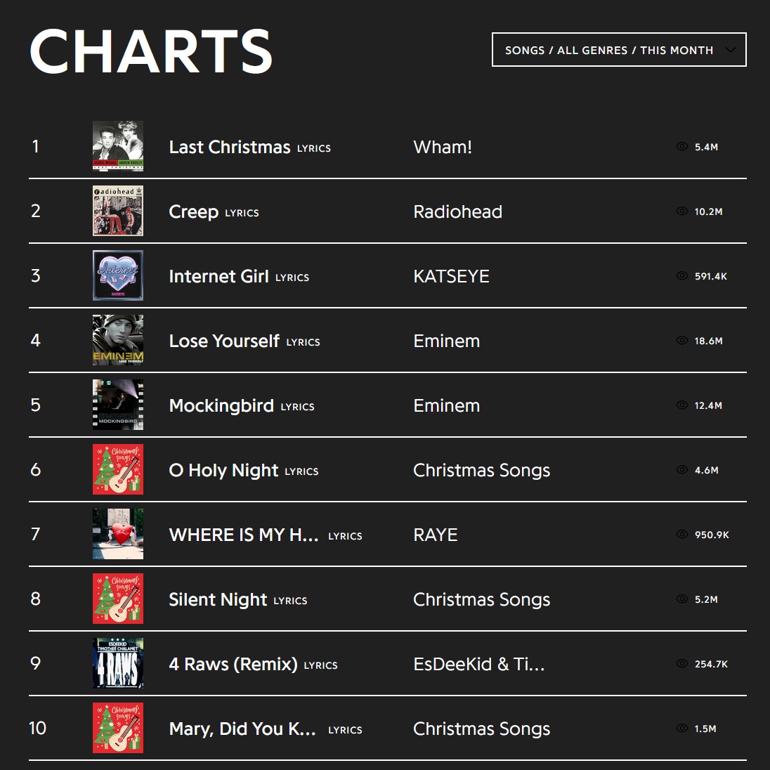So, he has never left. During December’s flood of Christmas classics, “Lose Yourself” and “Mockingbird” still held firm in the Top 10. Looking at the Genius 30-day chart, both tracks outrank many seasonal staples like “Silent Night” and “Mary, Did You Know?”