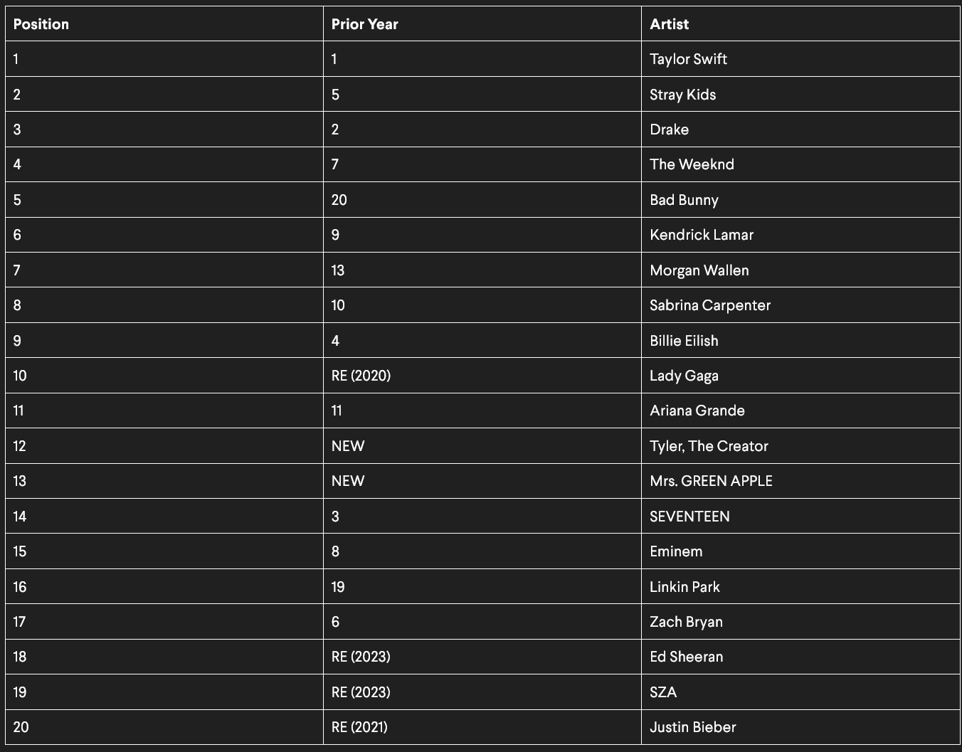 Top 20 IFPI Global Artist Chart 2025
