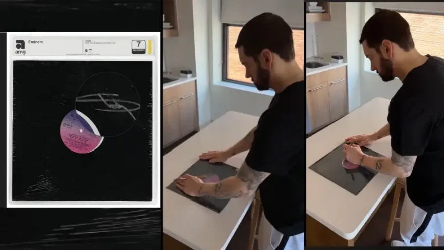 The item includes documents proving its provenance and the authenticity of Em’s signature. For the previous one, donated by Paul Rosenberg, we had a video of Eminem signing the album. This time, we have Ken Goldin, the force behind Goldin Auctions, demonstrating the record on his social media.