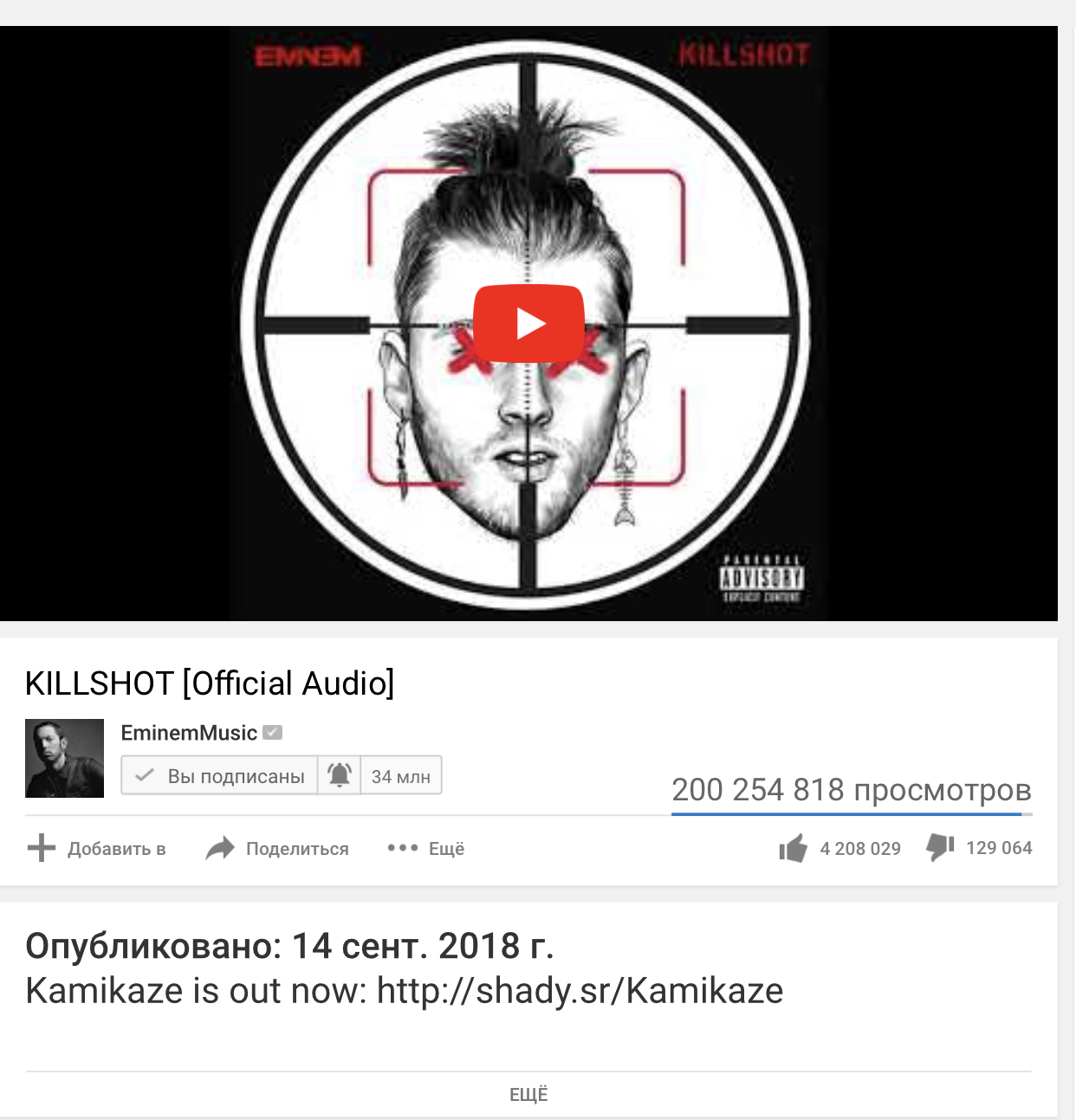Eminem’s “Killshot” surpassed 200 million views!By Stanley Mitchell / December 4, 2018 “Killshot” surpassed 200 million views n YouTube! Watch after jump.