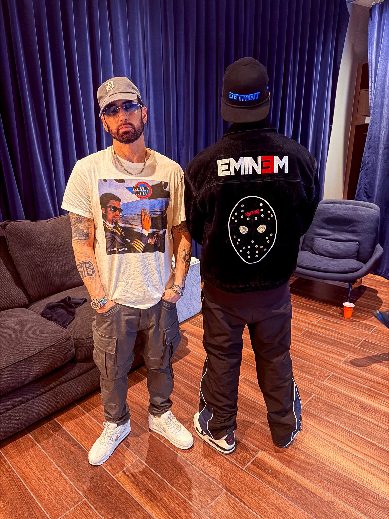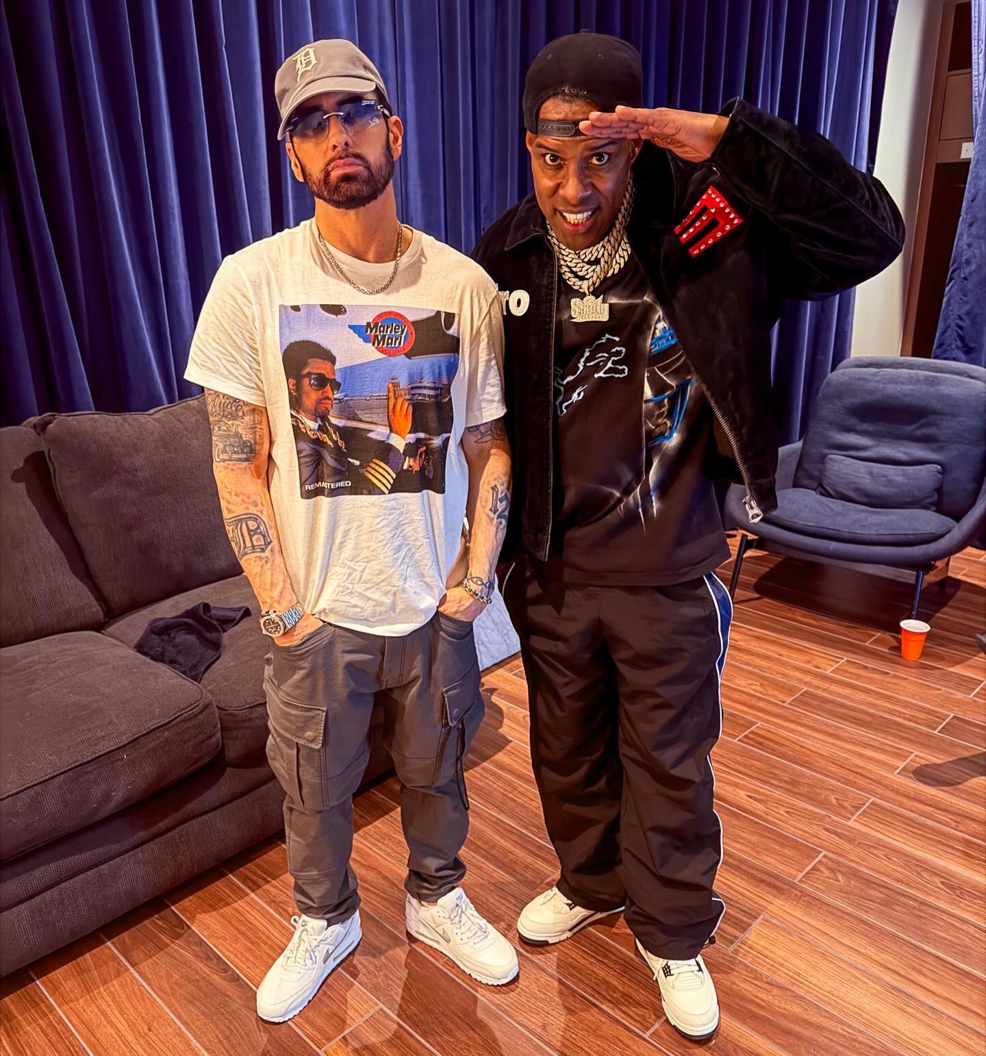 WhooKid, for his part, looked equally sharp. He wore his iced-out Shady Records chain, recently gifted by Eminem himself, and a hoodie printed with the Ferris hockey mask design from Em’s merch capsule.