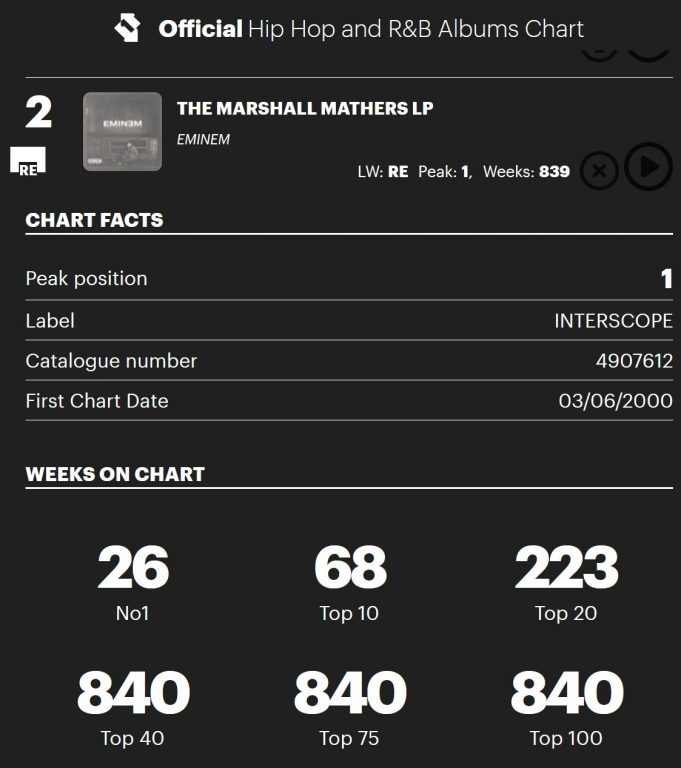 Meanwhile, on the Official Hip Hop and R&B Albums chart, “The Marshall Mathers LP” nearly retakes the top spot, landing at No.2 after spending years on that ranking: it is its 840th week in total, to be exact.