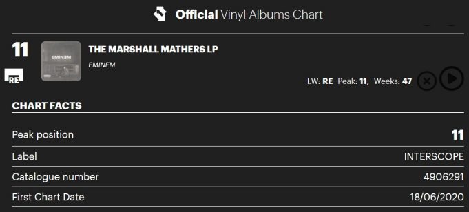 Following its special vinyl reissue, “The Marshall Mathers LP” re-entered both the Official Vinyl Albums and Official Albums Sales charts. It landed at No.11 on the vinyl list and No.24 on the overall sales ranking – both new all-time peaks for the classic.