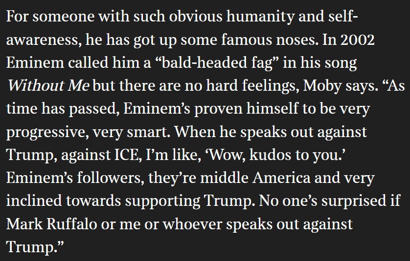 In Moby’s most recent interview with The Times, he is more articulate about how his opinion about Eminem has transformed over the years: “As time has passed, Eminem’s proven himself to be very progressive, very smart. When he speaks out against Trump, against ICE, I’m like, ‘Wow, kudos to you’. Eminem’s followers, they’re middle America and very inclined towards supporting Trump”.