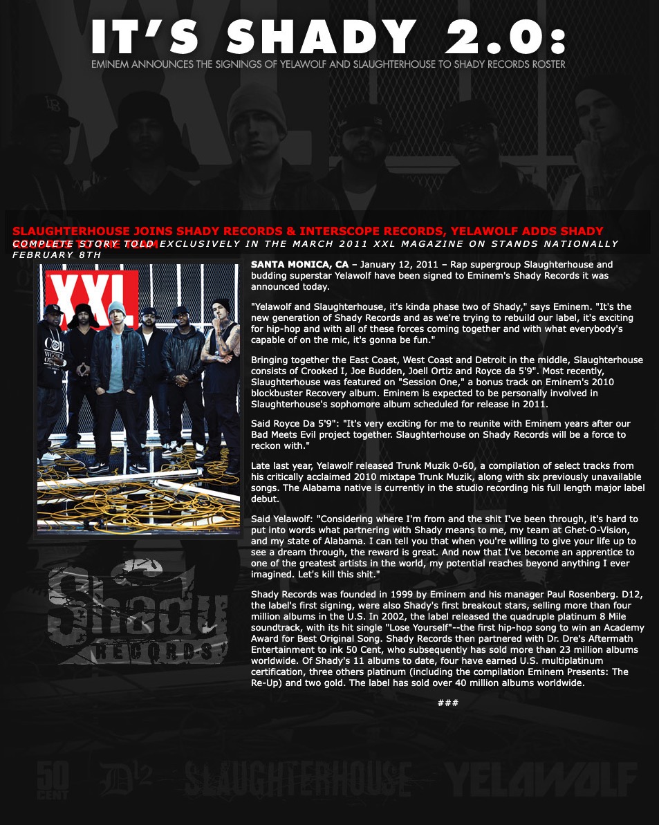SANTA MONICA, CA – January 12, 2011 – Rap supergroup Slaughterhouse and budding superstar Yelawolf have been signed to Eminem’s Shady Records it was announced today.