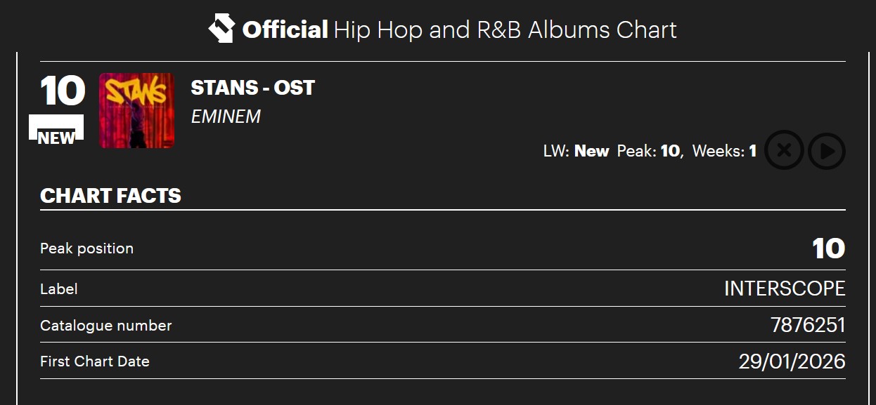 The previous week, Stans debuted at No.10 on the Official Hip Hop and R&B Albums chart in the UK. This brings Eminem’s total of top 10 projects on this genre-specific tally to 15.