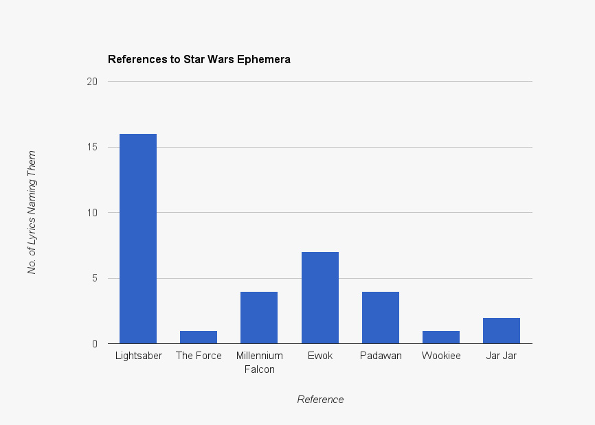 Depending upon how you feel about the furry bipeds of Endor, you’d be surprised how often rappers mention ewoks. But you shouldn’t be surprised to learn lightsabers get by far the most mentions. And some of the best references don’t even mention them by name. In “Gone Insane,” Ab-Soul raps, Skywalker in the blunt/Darth Vader in the cup. For a clue, (always) look to the lightsaber: Luke’s is green (marijuana), and Vader’s is red (cough syrup). We always wondered why Mace Windu wields a purple lightsaber, but never thought it might indicate a penchant for sizzurp.