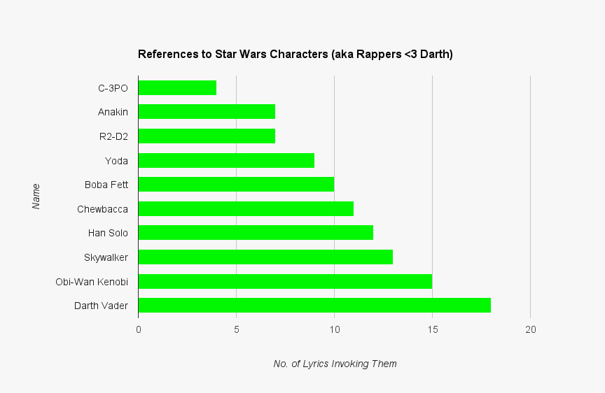 As the character with the most bling of all, C-3PO might be distressed to learn how rarely he’s name-dropped. (Still, he’s mentioned more often than Leia, who only gets two mentions, which is wrong on so many levels because she’s badass.) His count rises when you factor in the rappers who use the protocol droid as reference for a parole officer. Kanye did it on “Blessings” and Big Sean did it on “Celebrity”), but Method Man puts it most eloquently on “Rap Phenomenon” when he raps, Star Wars, I’m Han Solo with three egos/and three charges, I gotta see three P.O.s.