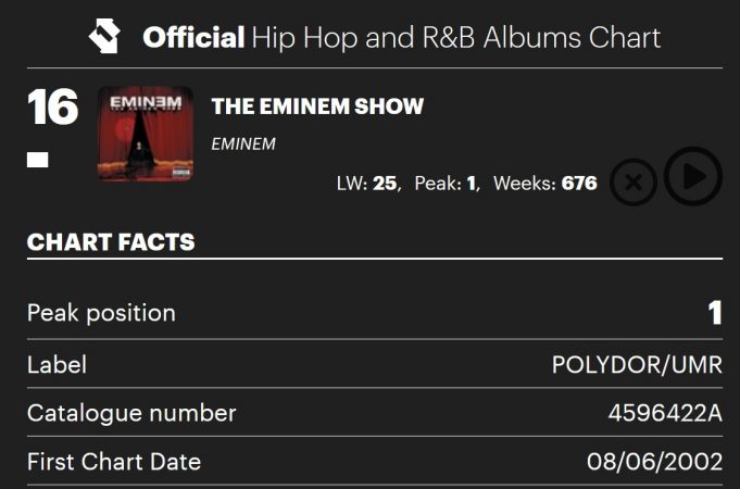Even now, “The Eminem Show” continues to thrive. It recently climbed from No.25 to No.16 on the UK Hip Hop & R&B Albums Chart, marking its 676th week on the list. That kind of staying power is rare. Yet for Eminem, it is normal.