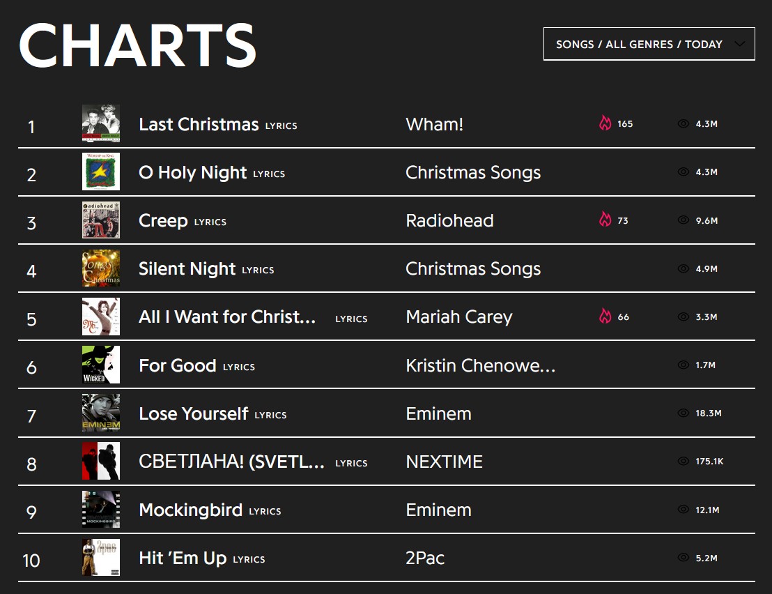 These two songs never leave the daily or weekly charts. Even right now, during December’s Christmas-song takeover, they stay in the rankings.