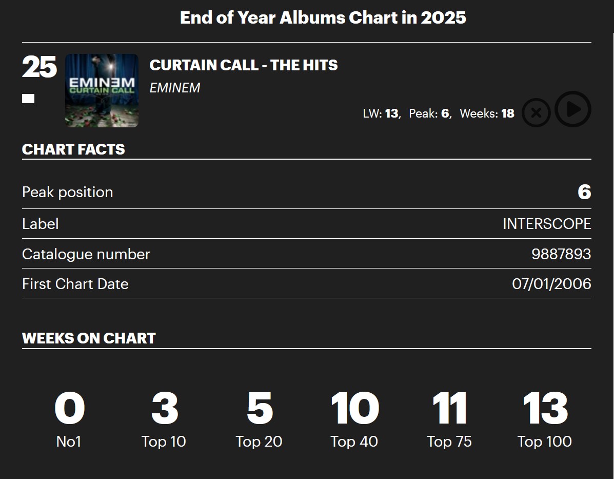Eminem’s “Curtain Call: The Hits” continues its remarkable run on the UK’s official End of Year Albums Chart, landing at No.25 for 2025. The compilation, released in 2005, has now charted 13 times in this year-end ranking – a feat unmatched by any other rap album.