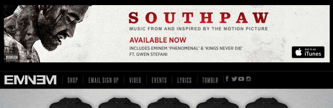 This is what the website looks like today. Yeah, there have been changes. There’s no Em-TeeVee and no Em-P3, anymore. There’s no bio. There’s no discography page. But there are still a lot of features on the websites. It’s just different. That’s life. But what hasn’t changed is Em’s still making music. He helped drop the Southpaw soundtrack this year and fans have to be hopeful that he’s got a tour or an album in store for 2016.