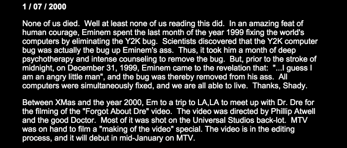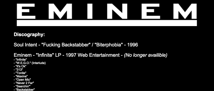 Think of this as Eminem’s Instagram in 2000. Sadly, a lot of the images don’t show up anymore, which proves not everything on the Internet lives forever. There are only a handful of classic photos left on the site and even those are kind of blurry. It’s hard to know exactly when they disappeared. So, I guess it’s also like Em’s Snapchat if you think of it as a long story that may have disappeared at some point in the last 15 years.