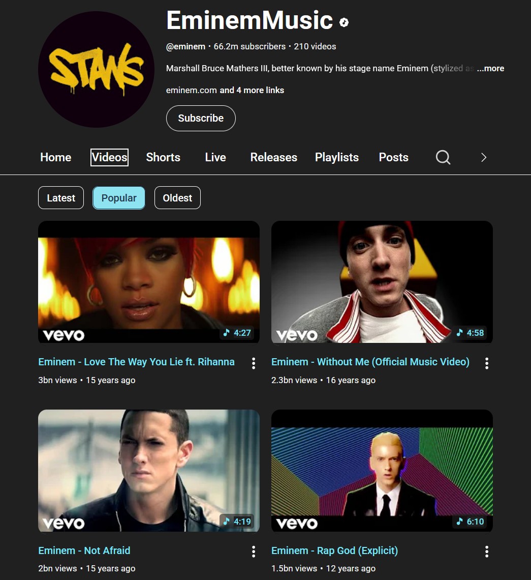 Rap artists consistently generate massive YouTube engagement, often far exceeding their audio-only streaming numbers. That includes Eminem, who remains the most watched hip hop artist globally and one of the most viewed American artists on the platform year after year.